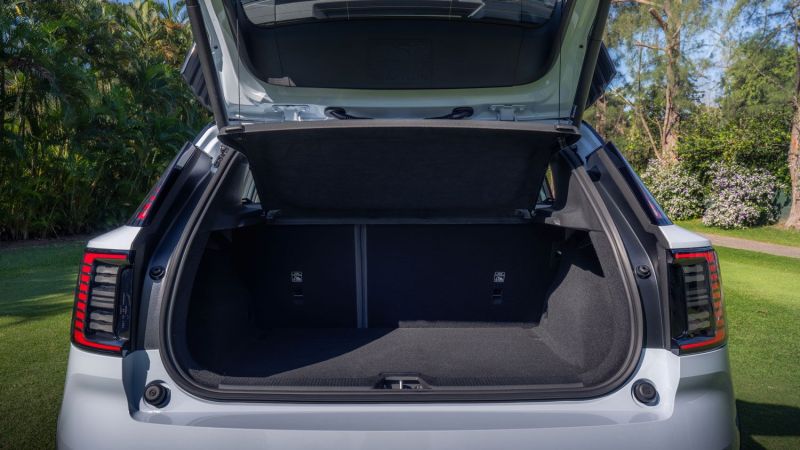 Llaman la atención, en términos de diseño, la ausencia de parrilla y los grupos ópticos que muestran una reinterpretación de los clásicos faros denominados “Martillo de Thor”. Atrás, el portón recibe a las ópticas bipartidas.